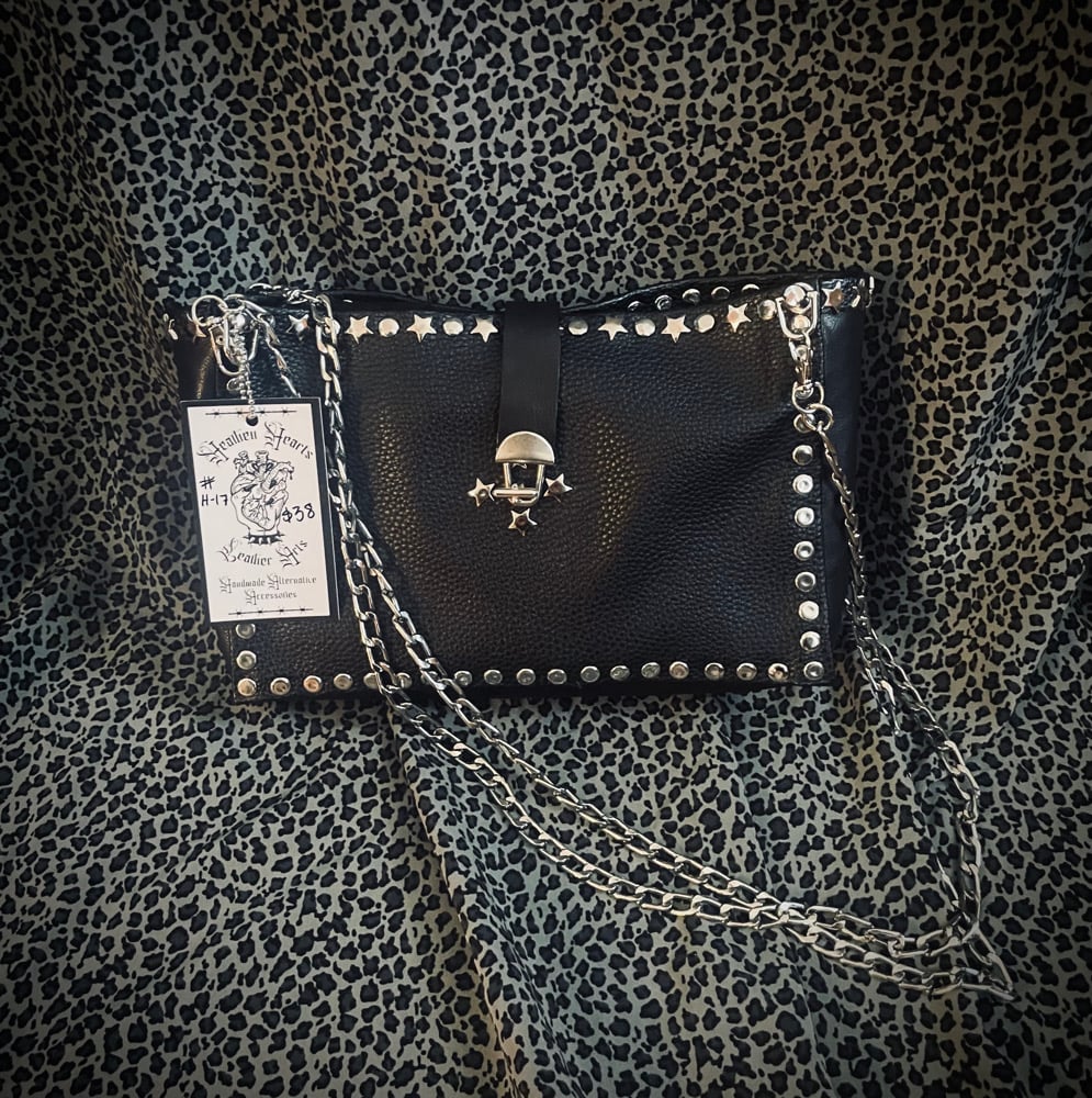 A cute yet vampy little rectangular chained shoulder strap purse with a metal buckle closure and adorned with silver star rivets.