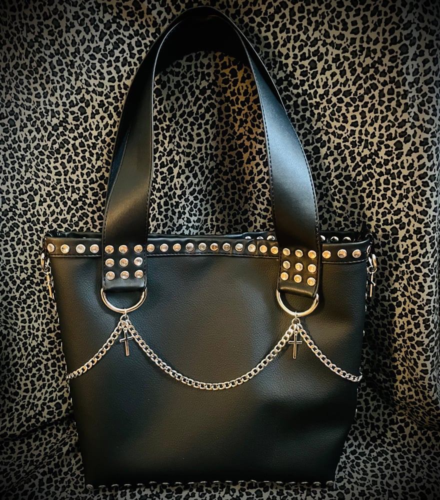A roomy and satiny lined handbag with sick chain details and silver hardware and a magnetic snap closure.